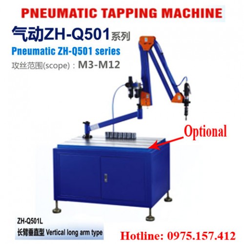 Máy ta rô cần khí nén ZH-Q501L là máy taro kim loại M3-M12 cần taro dài 2000mm. Nó chuyên dùng để taro trên kim loại: nhôm, gang, sắt thép tấm, taro thẳng đứng vuông góc phương ngang. Ưu điểm, tốc độ taro nhanh, gọn nhẹ, phạm vi làm việc lớn. Cần máy taro khí nén ZH-Q501L di chuyển tự do 360 độ. Trục chính đầu taro là dạng tháo lắp nhanh, gắn mũi taro nhanh chóng.